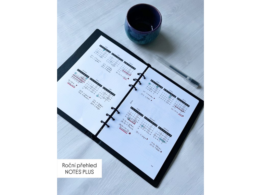 Notes Plus ti nabízí víc – prostor na poznámky pod každým měsícem. Zapiš si tam měsíční cíle, důležité termíny, události nebo plány, které nechceš zapomenout. Rychle spočítej, kolik dnů ti z čeho ještě zbývá, a zároveň si poznamenej kontext – proč sis ten den vzala, co se tehdy dělo. Formát Notes Plus nabízí i spoustu prostoru pro zápis narozenin nebo důležitých výročí.